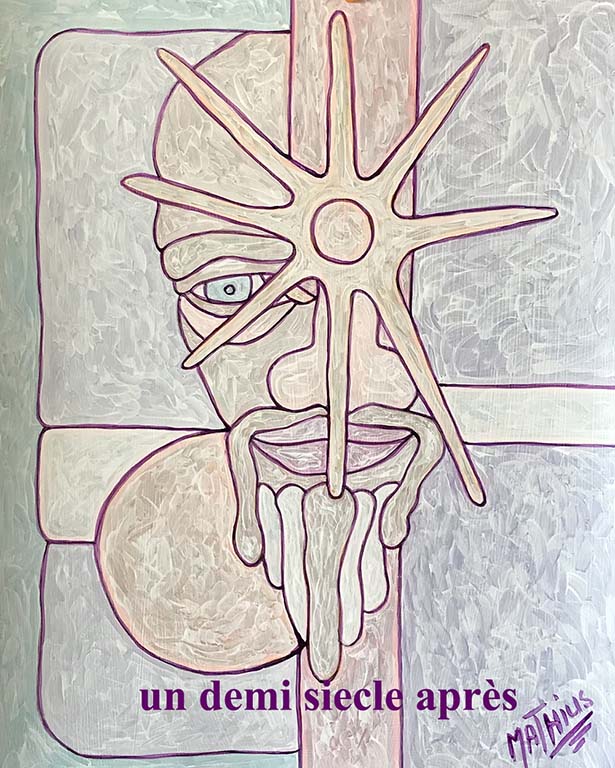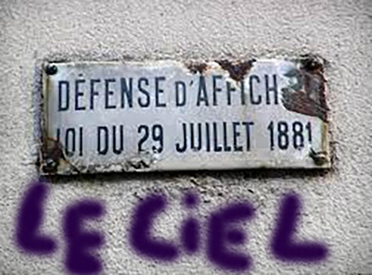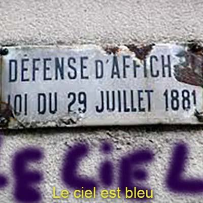Le chef de chantier injurie ses travailleurs et leur demande d’effacer les graffitis. La peinture blanche accroche bien au mur. Appliquer de la couleur dans les espaces délimités par les traits blancs apporterait des sensations incomparables au regard. Pour créer de telles œuvres, il me faudrait un atelier de la dimension d’un hangar. Mon sentiment d’impuissance m’étouffe et, pour me soulager de ma faiblesse, j’exécute, à une cinquantaine de mètres de l’église Saint-Séverin, un graffiti de trois mètres de large sur un mur « Défense d’afficher ». Des policiers en tournée découvrent la simplicité du slogan, « Le Ciel Est Bleu » ; au commissariat ils se contrefoutent royalement de mes explications. Le droit prévoit de punir les créateurs délinquants. En effet, selon les dispositions de la loi du 29 juillet 1881, je suis passible d’une amende. Mais, à dix-neuf ans, je suis encore mineur, on va alors me gratifier d’une existence pénale appropriée : le délit de vagabondage qui punit d’une semaine de prison est parfait dans mon cas. Finalement, au bout de 24 heures, je suis foutu à la porte du commissariat par le commissaire de police lui-même. Ma mésaventure policière démontre le ridicule des législateurs. En effet, le ministre Jules Ferry, président du Conseil, ministre de l’Instruction publique et des Beaux-Arts, et auteur de la loi, interdit à l’artiste « Mathius » d’écrire de la poésie sur un mur inesthétique et particulièrement sale.